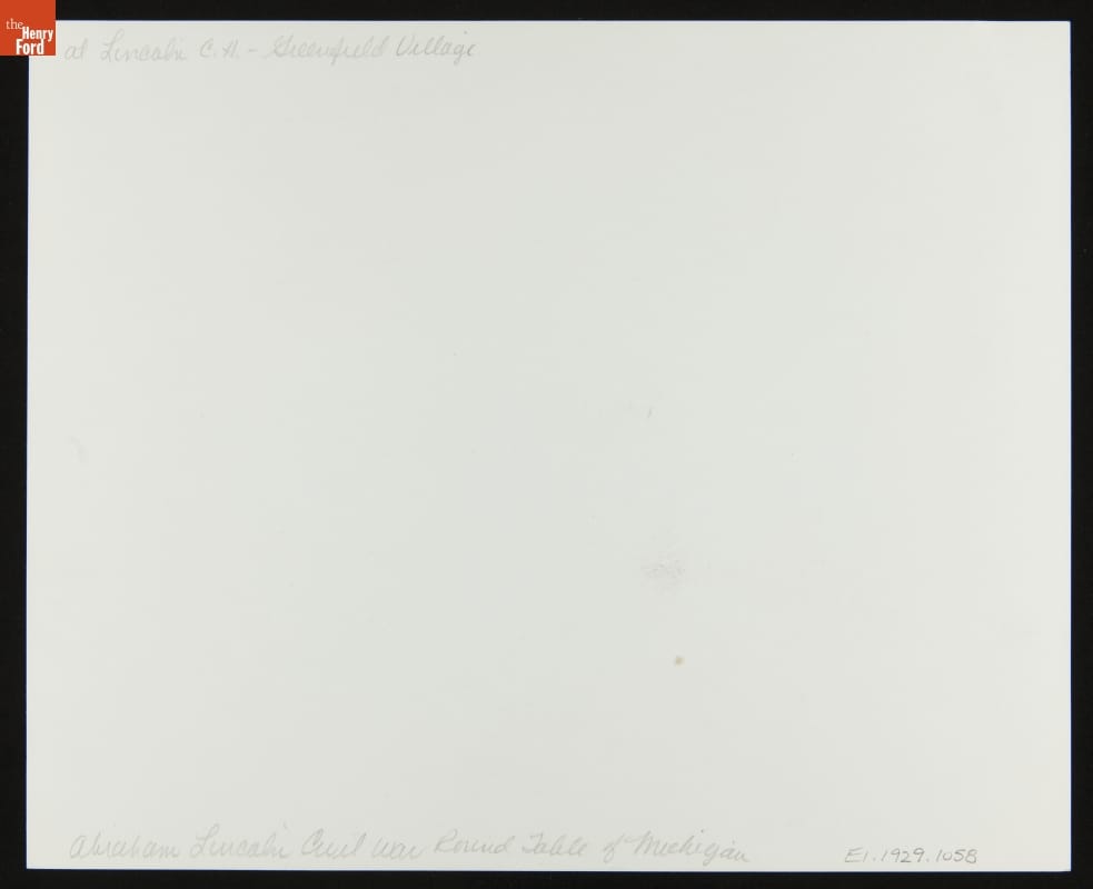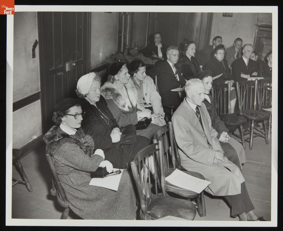 In 1929, Henry Ford purchased the Logan County, Illinois, courthouse in which Abraham Lincoln had practiced law in the 1840s. Ford had the building moved to Greenfield Village and filled it with Lincoln-related artifacts. The historic structure attracted those who studied and admired the 16th President. This photograph shows a meeting of the Abraham Lincoln Civil War Round Table of Michigan in the courthouse.