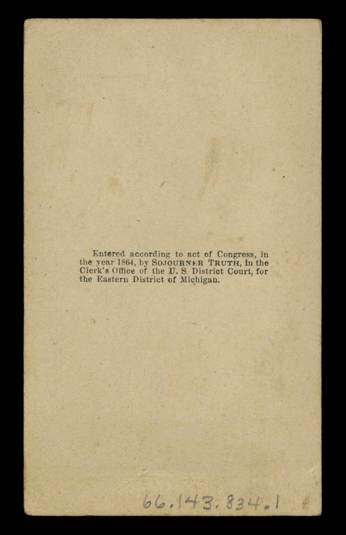Printed on back: Entered according to act of Congress in the year 1864 by SOJOURNER TRUTH, in the Clerk's Office of the U.S. District Court, for the Eastern District of Michigan.