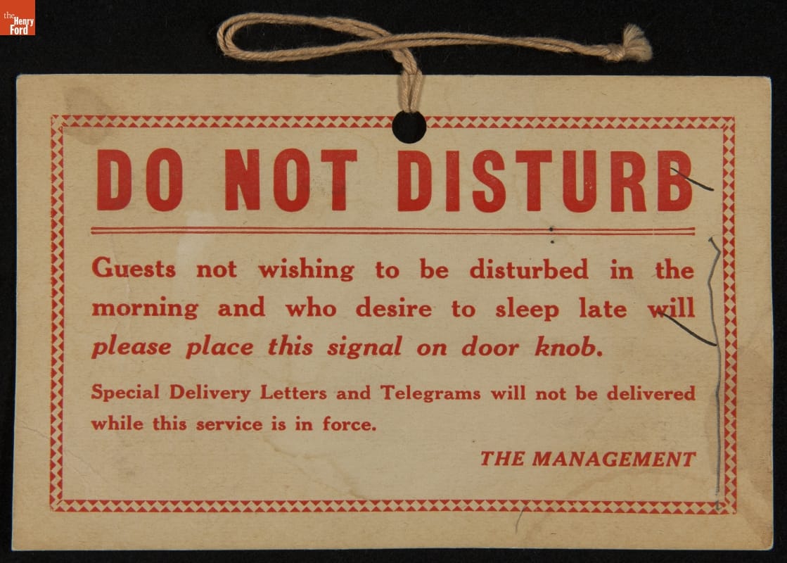 Like today, proprietors of mid-20th century hotels, motels and inns provided "Do Not Disturb" signs for weary travelers who wanted a restful stay. Guests placed the sign outside on their door to alert staff to please be quiet and not enter the room. This sign could also notify staff that the guests were away and that messages should be left at the lobby desk.