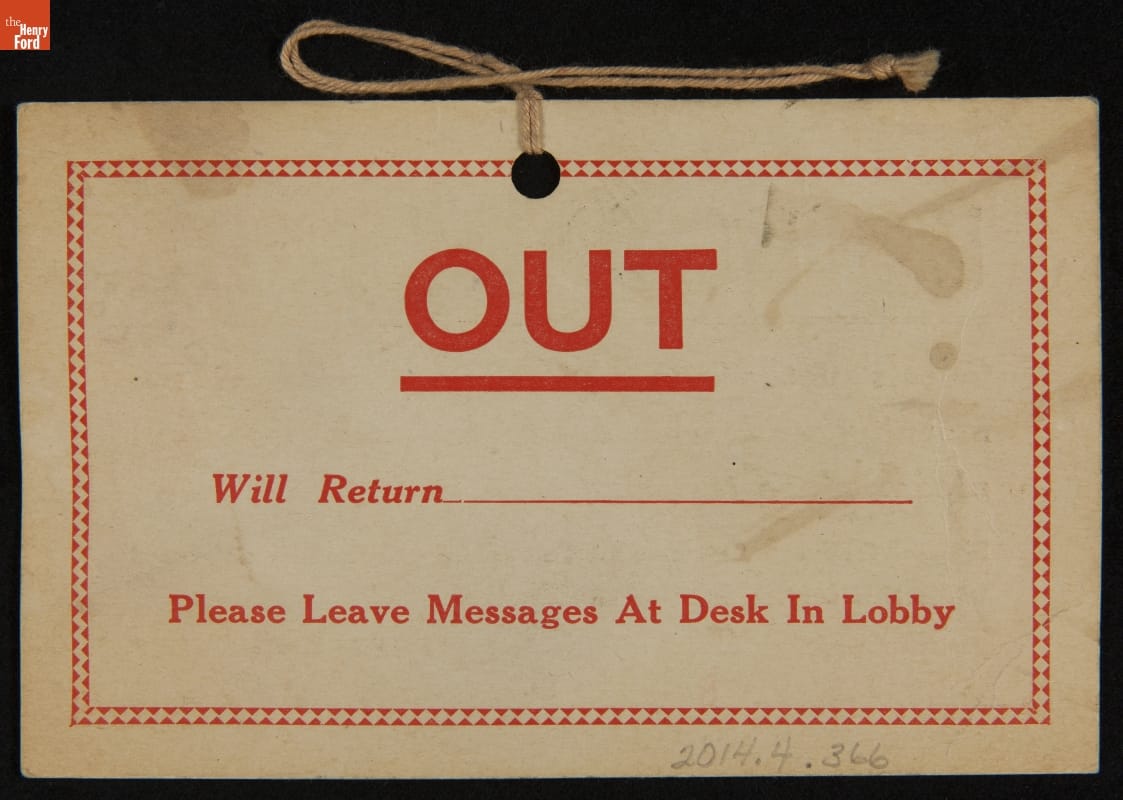 Verso: OUT / Will Return _______________________ / Please Leave Messages At Desk In Lobby