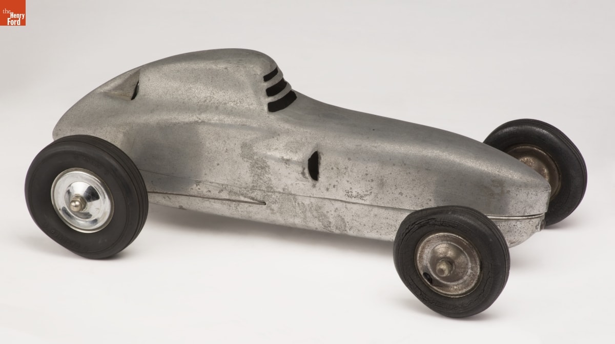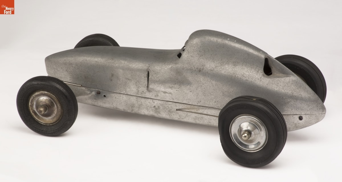 Tether cars, gas-powered model race cars, were popular in the 1930s and 1940s. They were raced individually while tethered to a central pivot, or against each other on a scaled-down board track. This model was built by Champion Products of Los Angeles. Scoops on the sides and slats in the "windshield" allowed air to reach the engine inside.