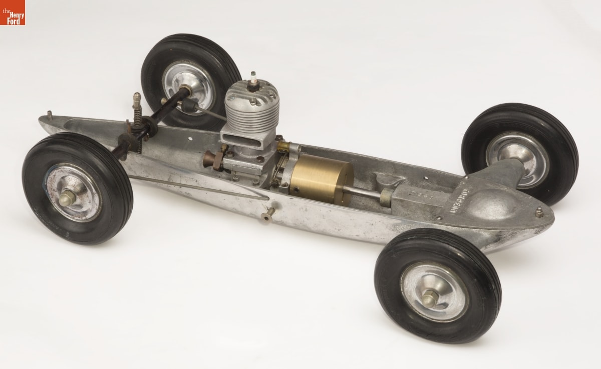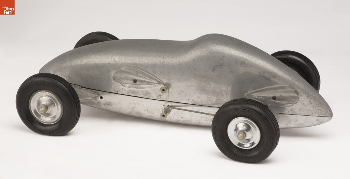 Tether cars, gas-powered model race cars, were popular in the 1930s and 1940s. They were raced individually while tethered to a central pivot, or against each other on a scaled-down board track. New York-based Airflow Industries advertised its "Defender" cars as the only ones "aerodynamically streamlined and wind-tunnel tested." This design process, the company boasted, was the secret to greater speed.