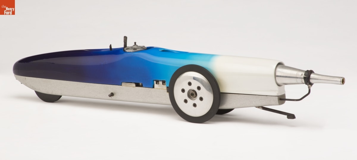 Tether cars, gas-powered model race cars, were popular in the 1930s and 1940s. They were raced individually while tethered to a central pivot, or against each other on a scaled-down board track. The models found new appreciation in the 1980s and 1990s. Garold Frymire built some 320 streamliners. The exhaust pipe on this one is tuned in length for maximum performance.