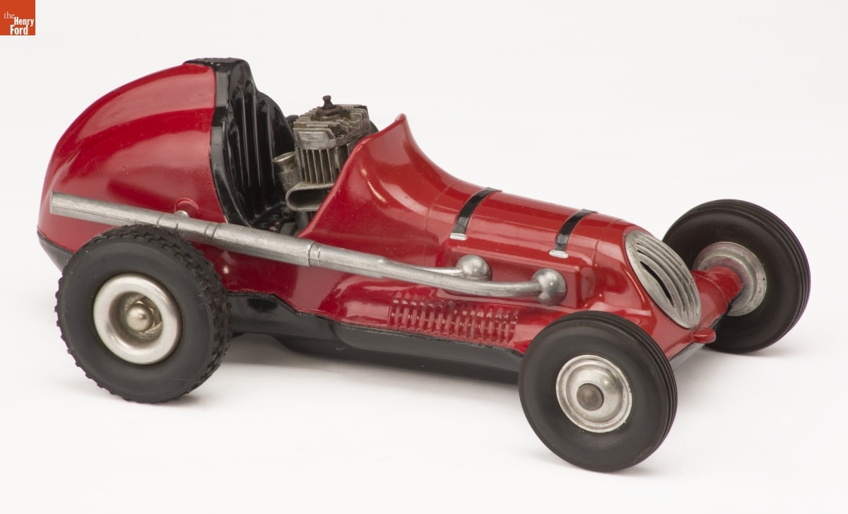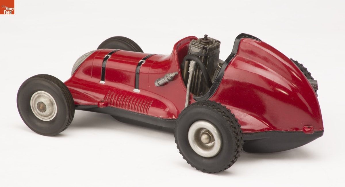 Tether cars, gas-powered model race cars, were popular in the 1930s and 1940s. They were raced individually while tethered to a central pivot, or against each other on a scaled-down board track. This aluminum-bodied car was produced by the L.M. Cox Manufacturing Company of Santa Ana, California. Cox was among the largest makers of model kits and model gasoline engines.