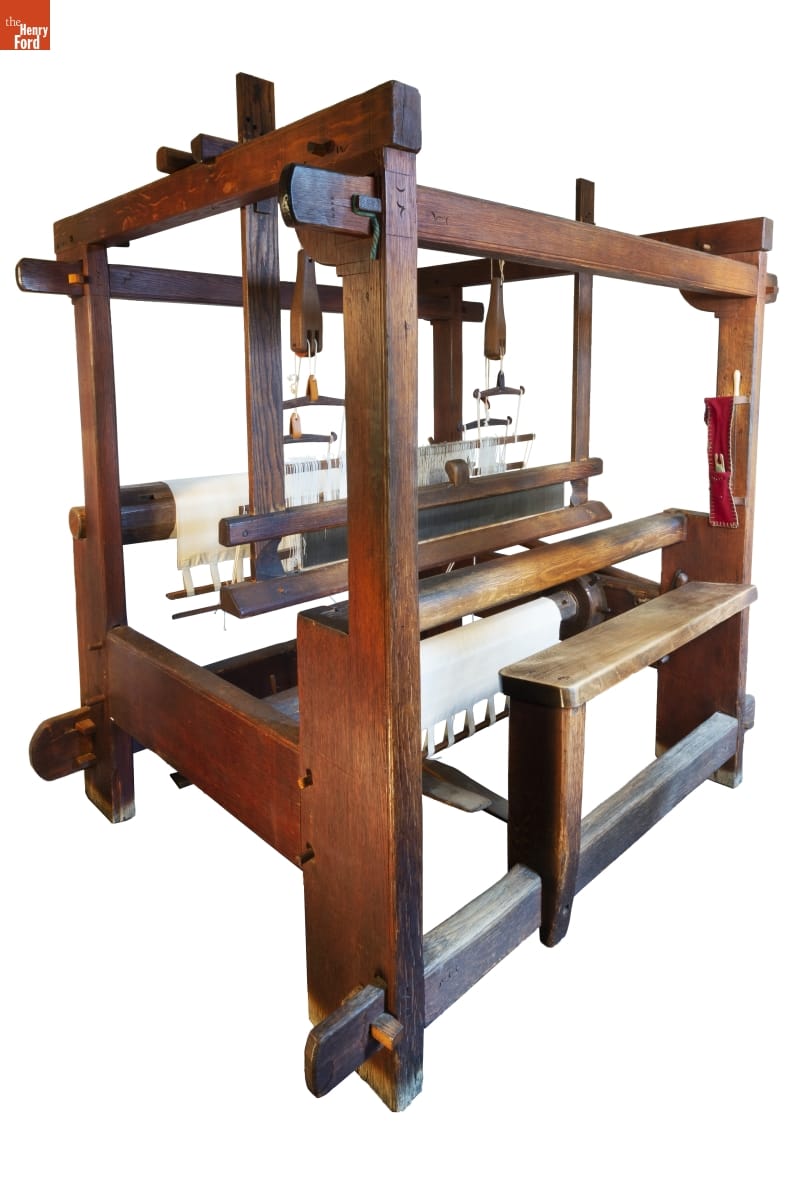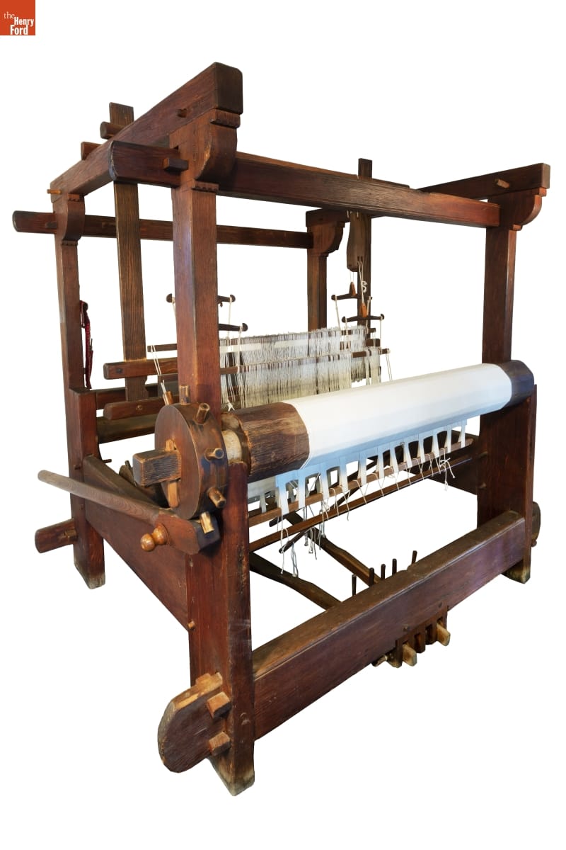 This timber frame loom is the type used by American colonists to produce fabrics for clothing, table and bed linens, and utilitarian items like towels and sacks. Hand weaving was labor intensive, so these textiles were among the most valuable household items. Many weavers were professionals, weaving at home or in a small workshop, but some families also had looms to produce their own cloth.