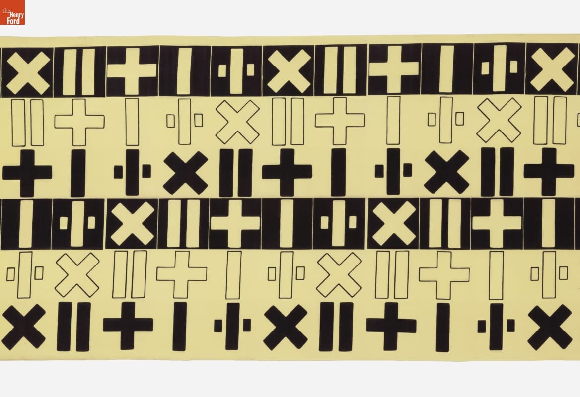 In 1956, Eliot Noyes was hired by IBM to create a holistic corporate identity program--the first of its kind. Noyes employed midcentury design luminaries to unite IBM's brand identity: logos to packaging, company culture to architecture. This screen-printed fabric references Paul Rand's graphic work for IBM, but was executed by Angelo Testa, a notable Chicago textile producer and designer.