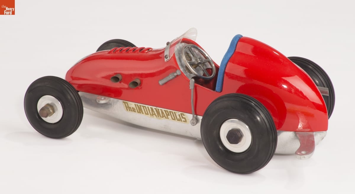 Tether cars, gasoline-powered model race cars, were popular in the 1930s and 1940s. They were raced individually while tethered to a central pivot, or against each other on a scaled-down board track. This model of an Indianapolis-style car was built by Barney (B.B.) Korn. It used a .29-cubic-inch engine. While Korn's models weren't particularly fast, they showed exceptional craftsmanship.