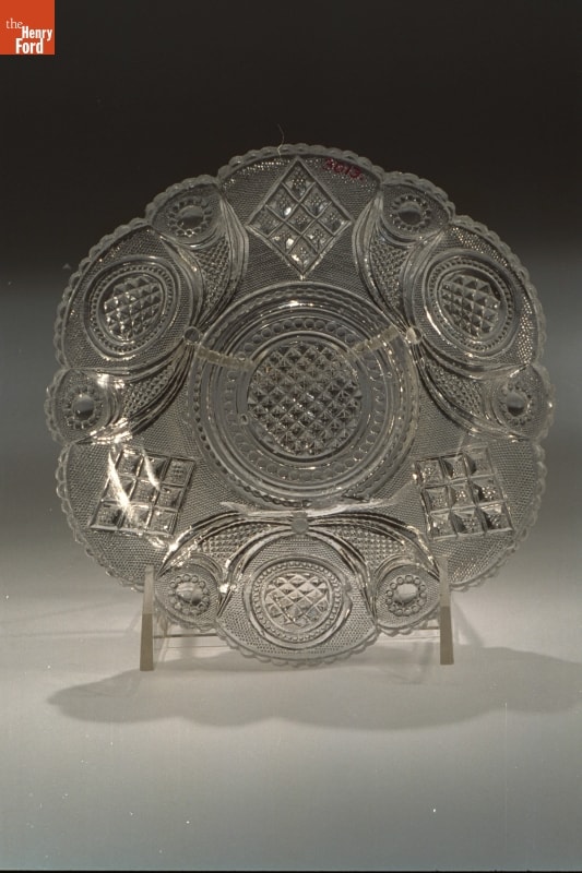 Mechanically pressed glass was an innovation in glass history, making decorative, "patterned" glass available to a broad audience. One of the earliest types of pressed glass, dating to the 1830s is known as "Lacy Glass". Complex stippled patterns were developed to help hide technical defects caused by early presses, when the glass gather was cut off and dropped into a mold.