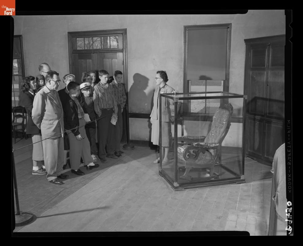 Guide Virginia Cook Presenting the Abraham Lincoln Chair, Then on Exhibit in Greenfield Village, April 1955