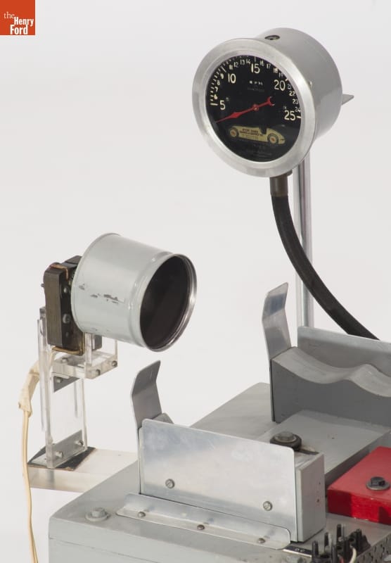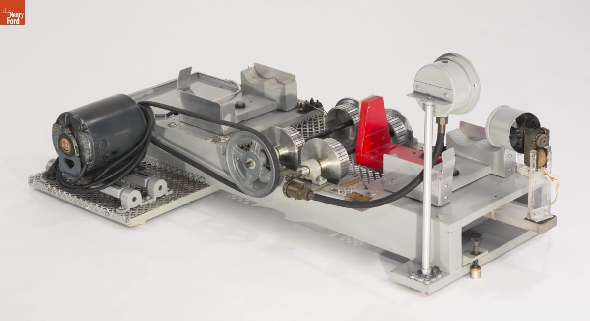 Tether cars, gas-powered model race cars, were popular in the 1930s and 1940s. Barney Korn was among the most skilled builders. His models were exceptionally detailed. Korn even made model cars, boats, and airplanes for Hollywood movies. Korn built this working dynamometer to test his model cars. It was adjustable for rear or front-wheel-drive models.