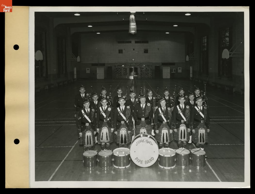 The Ford Motor Company sponsored a number of employee bands. In 1932, workers formed the Ford Pipe Band. This group of accomplished pipers and drummers competed throughout the US and Canada winning numerous awards. They disbanded during the Second World War, but reorganized in the late 1940s with several former members. The Ford Motor Pipe Band, seen here, continued to perform at parades, events and competitions.