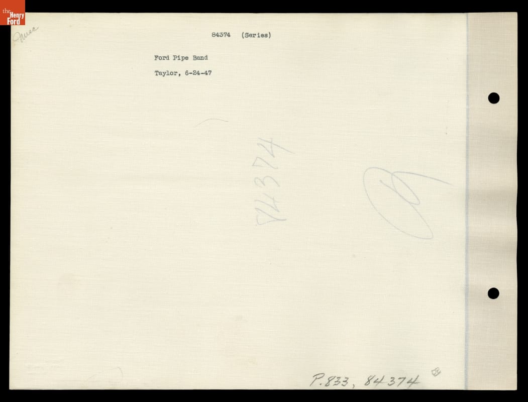 Typewritten on back: 84374 (Series) / Ford Pipe Band / Taylor, 6-24-47
