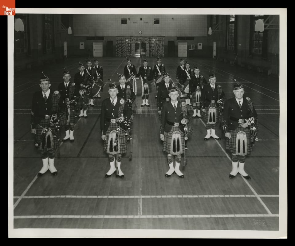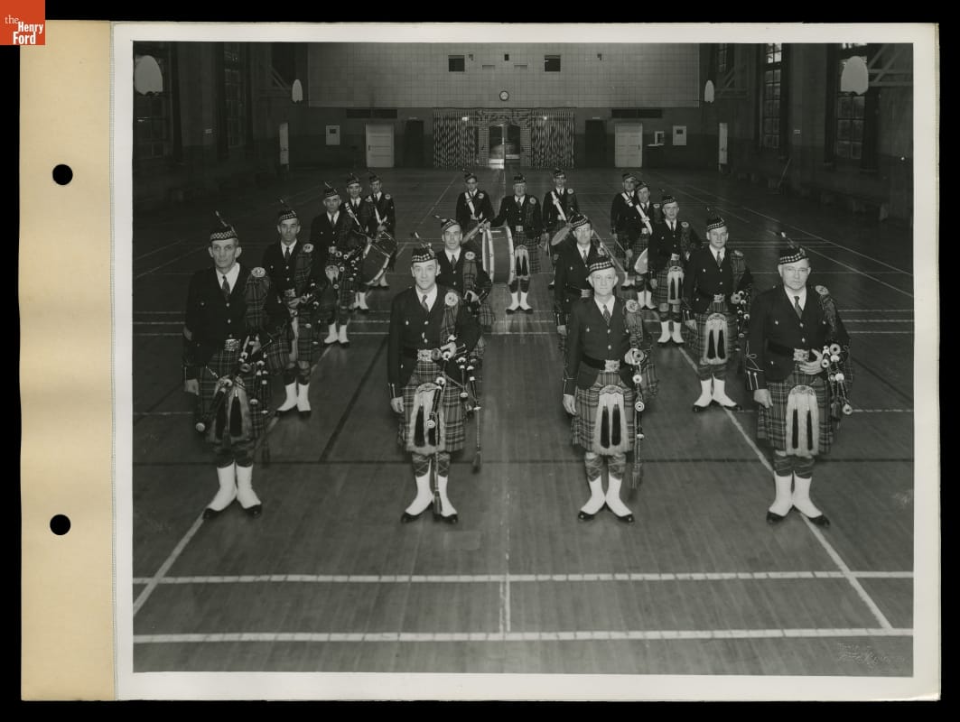 The Ford Motor Company sponsored a number of employee bands. In 1932, workers formed the Ford Pipe Band. This group of accomplished pipers and drummers competed throughout the US and Canada winning numerous awards. They disbanded during the Second World War, but reorganized in the late 1940s with several former members. The Ford Motor Pipe Band, seen here, continued to perform at parades, events and competitions.