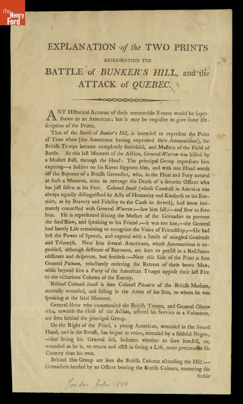 "Explanation of the Two Prints Representing the Battle of Bunker's Hill and the Attack of Quebec," 1785-1798