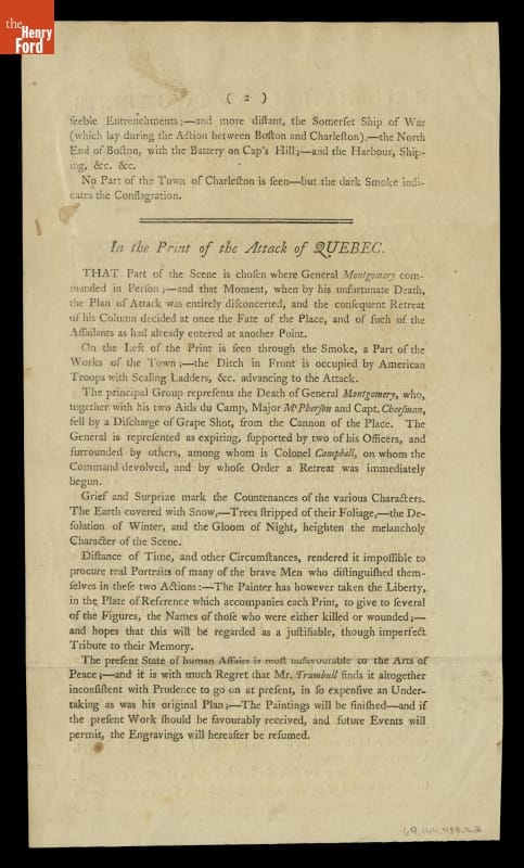 American artist John Trumbull finished The Battle of Bunker's Hill and Attack of Quebec in 1786 while studying in England. He hoped to sell prints of these two history paintings and produced this broadside promoting the works.