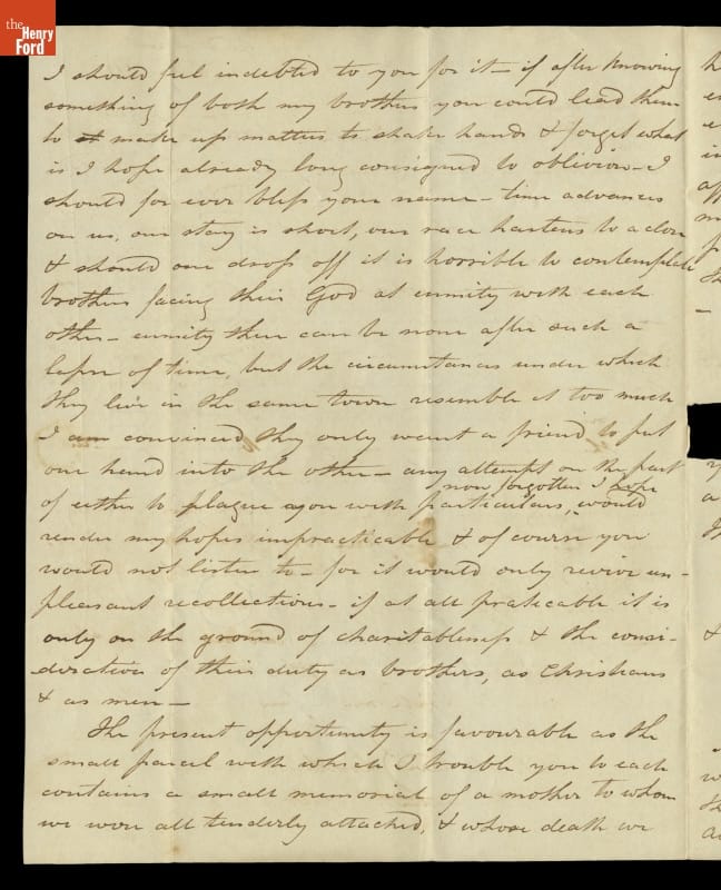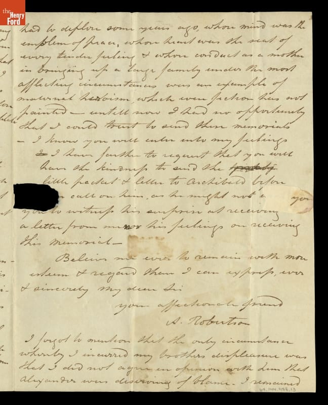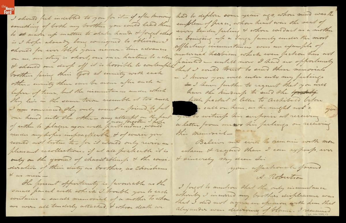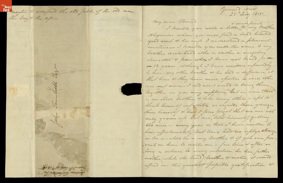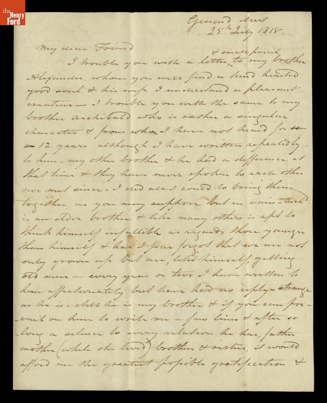 Andrew Robertson, a miniature-painter from Scotland, wrote fellow artist John Trumbull asking for help with a family dispute. Andrew's brothers, Archibald and Alexander, had had a falling out since immigrating to America in the 1790s. Andrew tried to remain neutral but had not heard from Archibald. He implored Trumbull to contact Archibald and deliver a letter and parcel that hopefully would repair the breech.