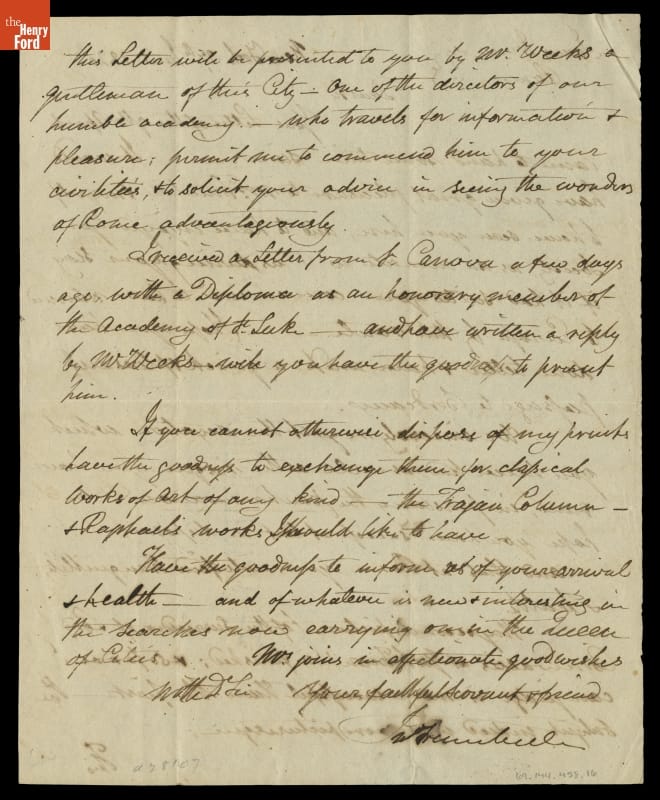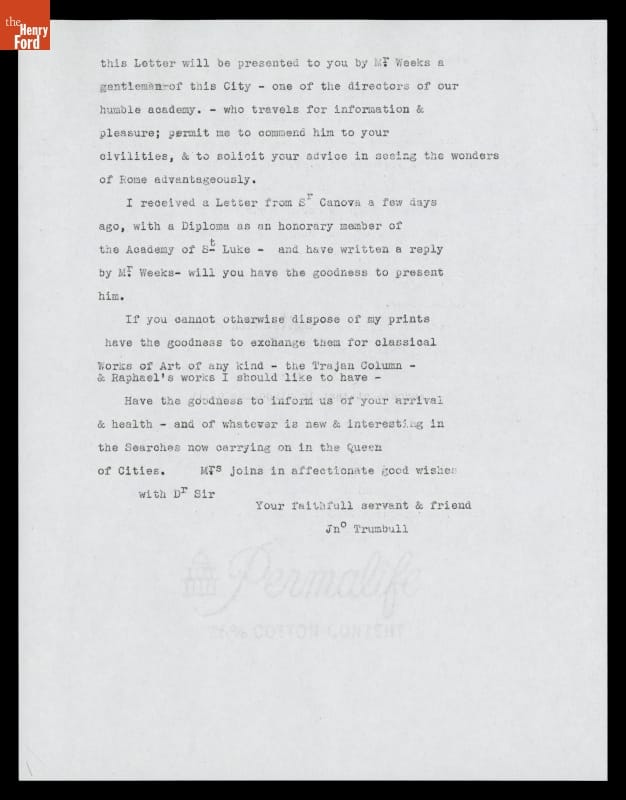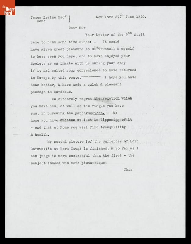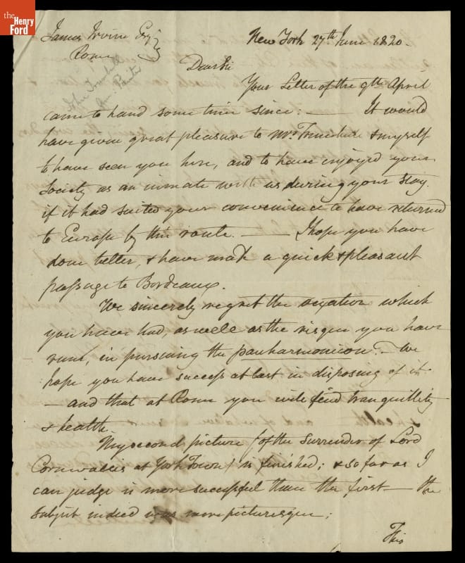 John Trumbull wrote this cordial letter to James Irvine, a painter and art dealer from Rome, Italy. Trumbull regretted that the two did not meet before Irvine headed back to Europe. He also mentions that he has completed Yorktown, his second of four works commissioned by the U.S. Congress for the Capitol.