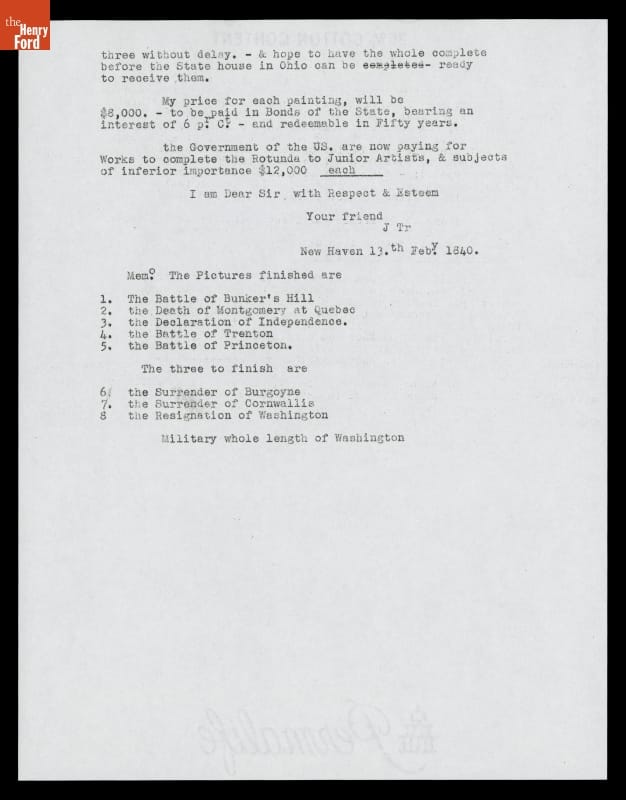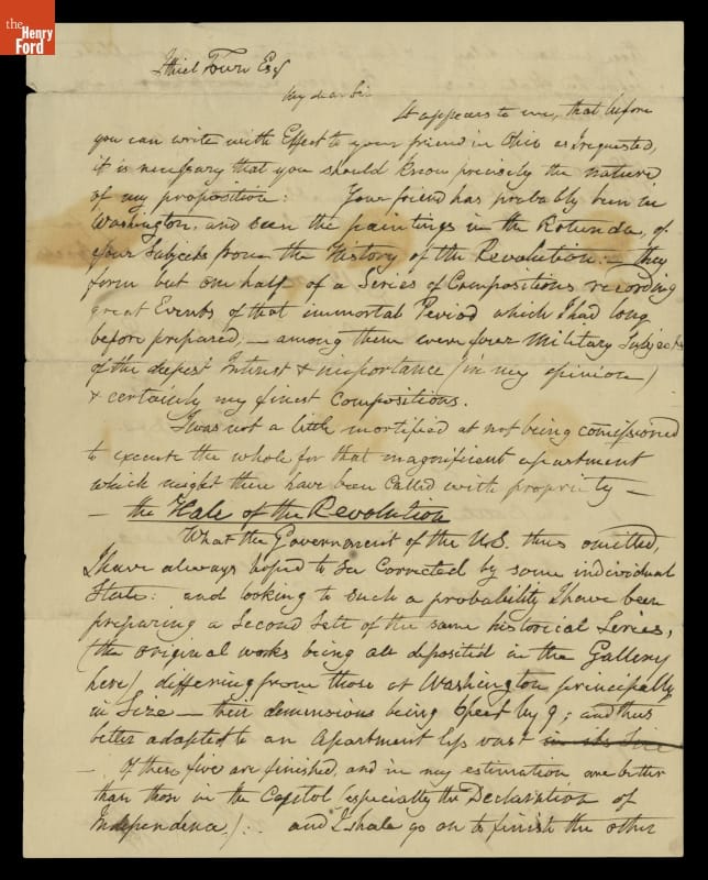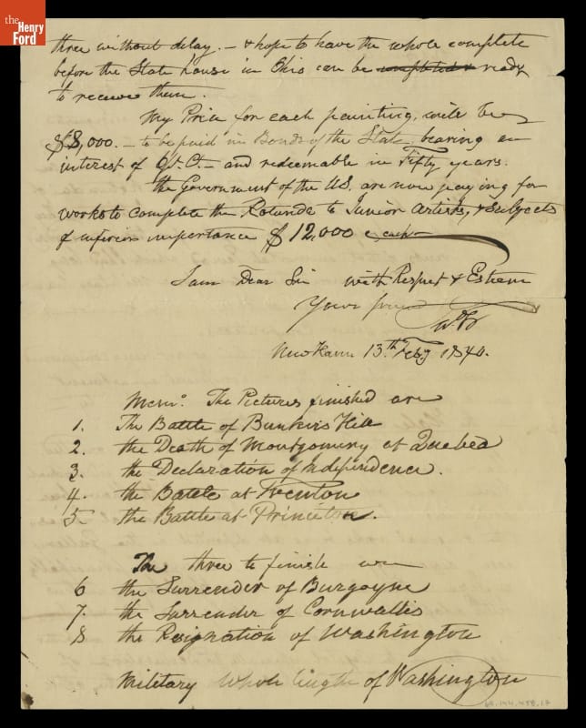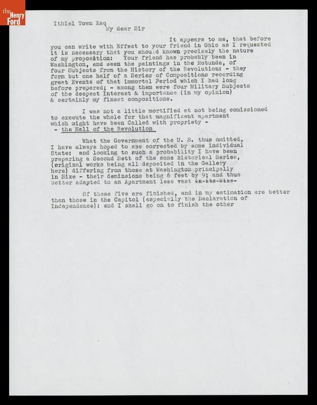 Artist John Trumbull wanted to display a series of his paintings based on Revolutionary-era scenes in some permanent gallery. These eight patriotic works would include smaller versions of his four paintings that hung in the U.S. Capitol. In 1840, the aging Trumbull wrote architect Ithiel Town about the works, their prices and his vision of the project.