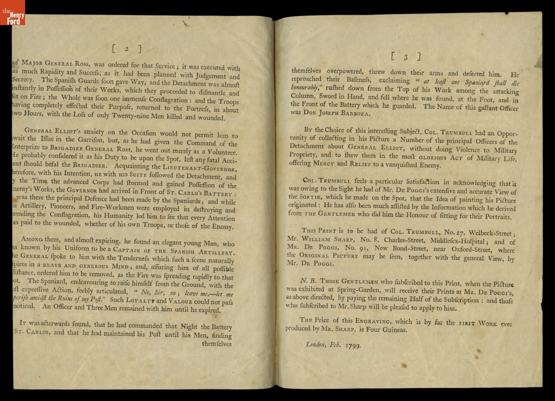 American artist John Trumbull painted The Sortie Made by the Garrison of Gibraltar while studying in England. Trumbull worked on the painting for three years from 1786 to 1789. Ten years later he sold prints to interested patrons. This pamphlet describes the military actions leading up to the scene depicted in the painting and provides instructions on how to purchase a print.