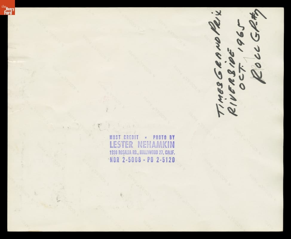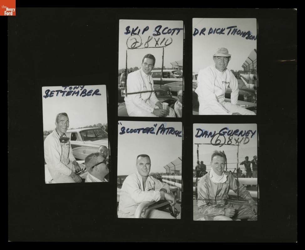 Dave Friedman captured and preserved auto racing history through his photography. His work -- and his collection of works by other photographers -- documents key races, vehicles, drivers, and teams. This contact sheet contains images from the 1965 Los Angeles Times Grand Prix at Riverside. "Hap" Sharp piloted a Chaparral 2 -- cars that dominated the 1965 United States road racing circuit -- to victory.