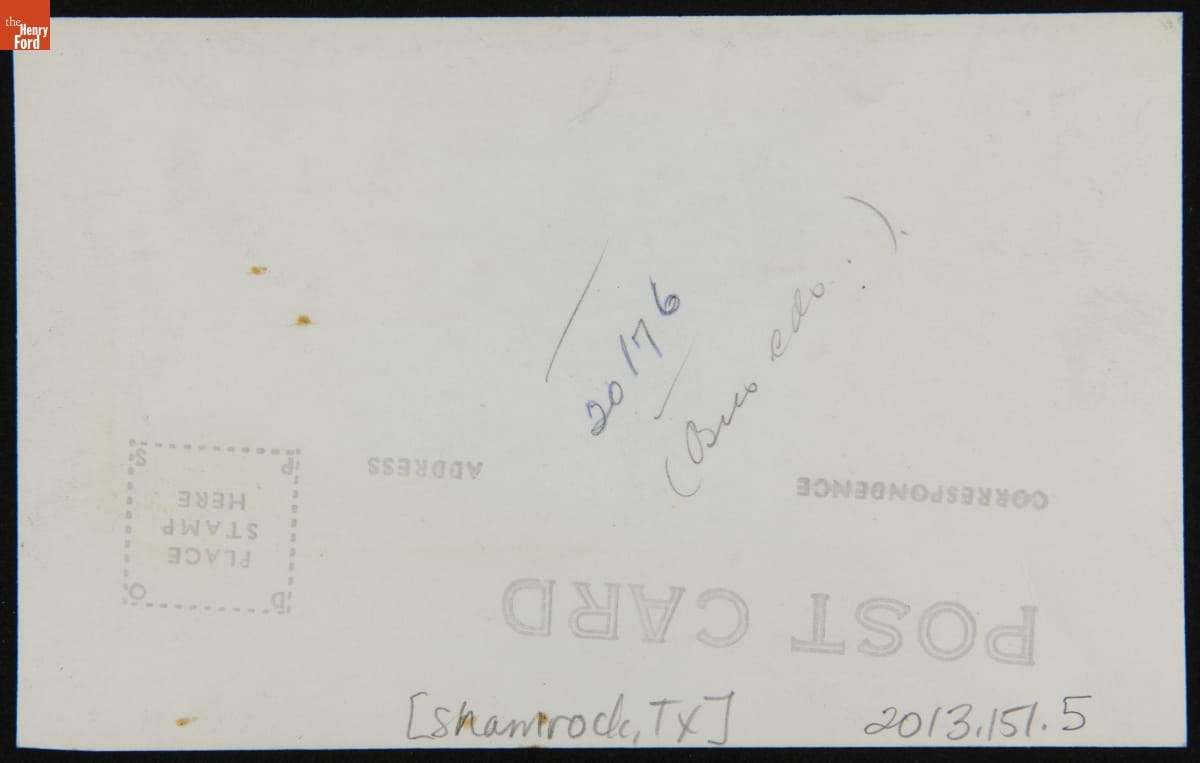 Photographic cards like this one, with their glued-on labels, were a preliminary step taken by Dexter Press before producing postcards for small-business owners to mail or hand out to customers. Built 1936 along Route 66 in Shamrock, Texas, this Streamlined Moderne-styled building included a Conoco service station, a cafe, and an intended retail area that became overflow cafe seating.