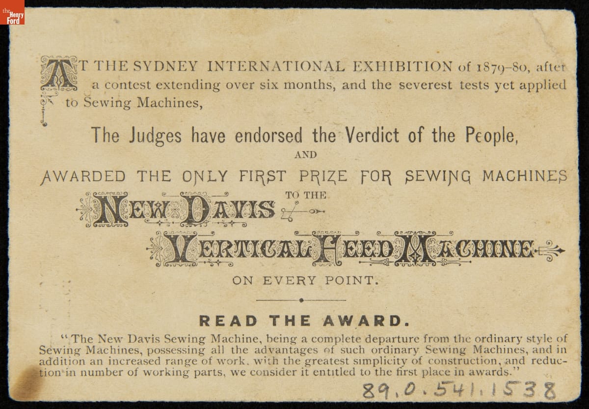 Trade Card for the New Davis Vertical Feed Sewing Machine, The Davis Sewing Machine Co., circa 1880
