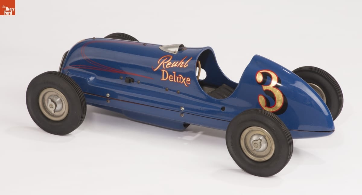 Tether cars, gas-powered model race cars, were popular in the 1930s and 1940s. They were raced individually while tethered to a central pivot, or against each other on a scaled-down board track. This Reuhl Deluxe was considered a prototype class car in competition. It resembled a real open-cockpit race car, and its engine sat under the hood.