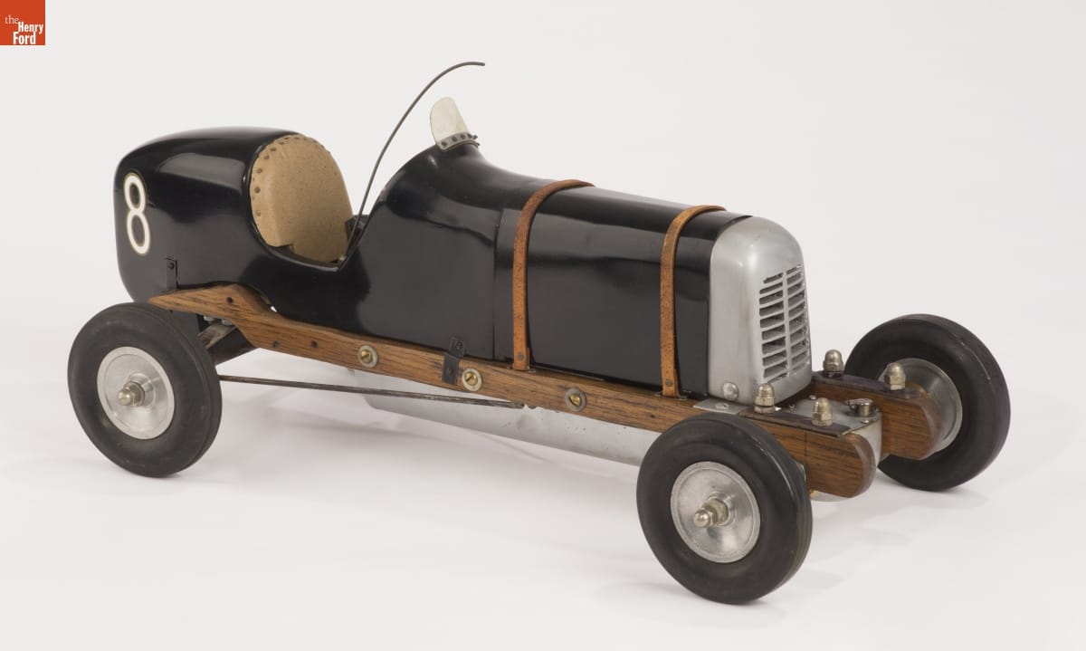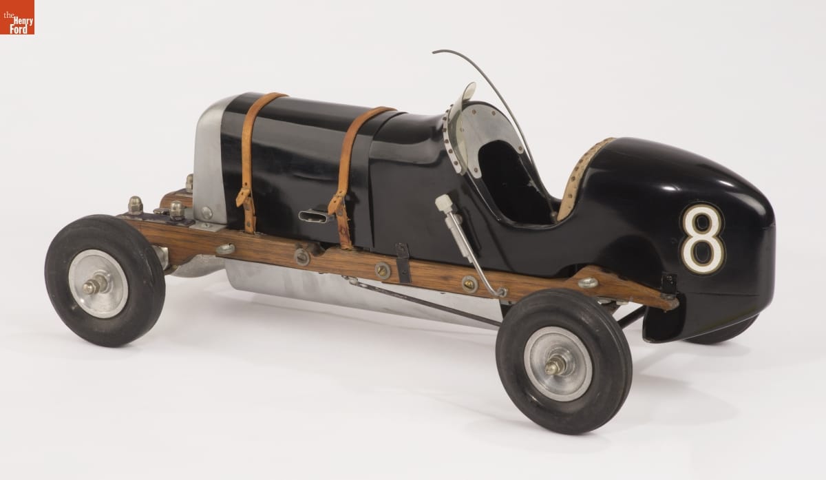 Tether cars, gas-powered model race cars, were popular in the 1930s and 1940s. They were raced individually while tethered to a central pivot, or against each other on a scaled-down board track. This is one of about six or eight models built by Charles "Zip" Grandell. Note the front-wheel-drive differential housing, and the suspension leaf springs at rear.