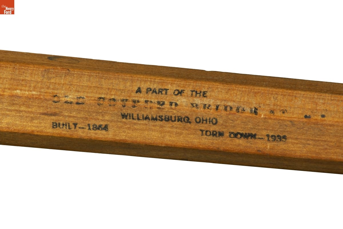 Covered bridges were built across the United States throughout the 19th century. Walls and roofs protected their wooden truss systems and kept structural timbers dry. Despite their purely practical design, covered bridges had nostalgic appeal, and local residents treasured them long after their utility faded. This walking stick was made from part of a Civil War-era bridge razed in the 1930s.