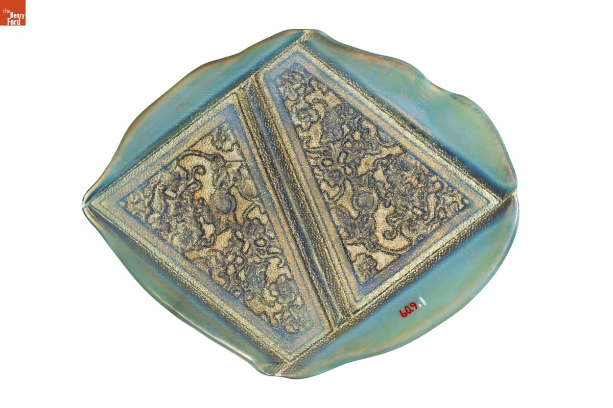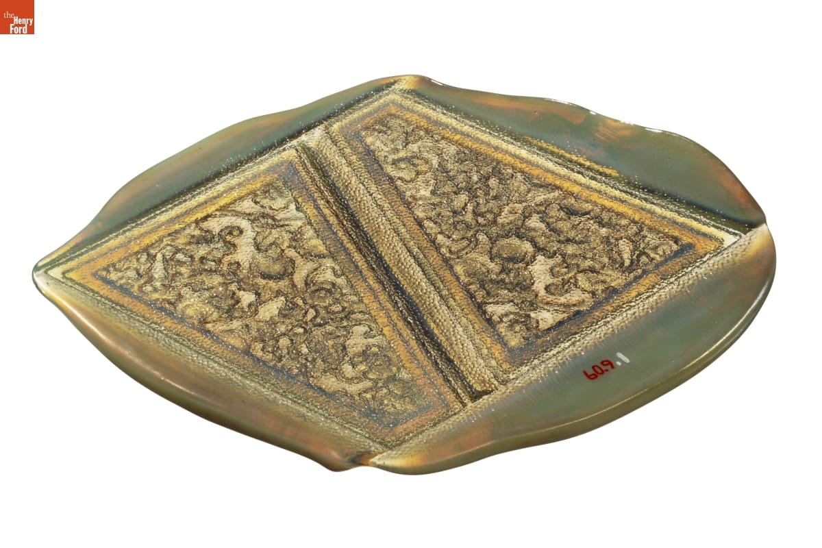 This tile is an example of pressed glass made at the Tiffany Furnaces. The two trapezoidal panels have not been "cracked out, meaning that the excess glass surrounding the tile from the molding process have yet to be removed. These panels were used to make small lampshades, other panels of this type were made for use in small decorative boxes.