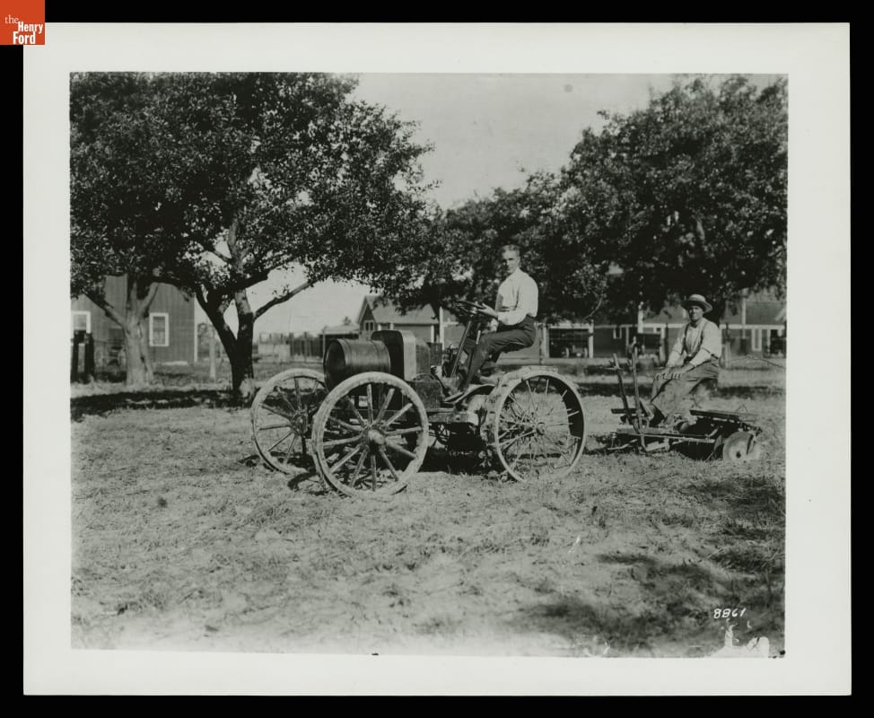 Henry Ford expressed an early interest in power farming. He and two associates married parts from the 1905 Model B and 1907 Model K, added rear wheels from a grain binder, and built the lightweight "automotive plow" seen here. This early experimental tractor was one in a series of designs culminating in the production of the Fordson tractor in 1917.