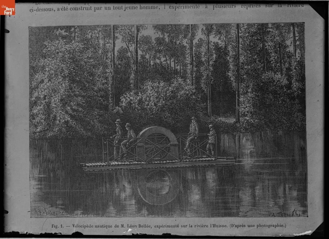 Illustration of Men on an Aquatic Velocipede on the Huisne River, France, circa 1900