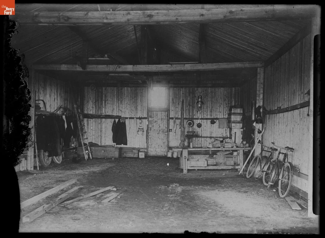 Just as he and his brother had done in North Carolina earlier in the decade, Wilbur Wright used a simple wooden hangar as his base of operations during his demonstration flights in France in 1908-1909. In addition to a workbench and tools for the airplane, the hangar included cooking utensils and a pantry stocked with canned goods.