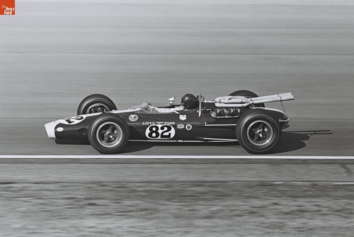 Jim Clark changed the face of the Indianapolis 500 in 1965 with his victory in a Lotus Type 38 powered by a rear-mounted Ford V-8 engine. Indy traditionalists, more familiar with front-engine roadsters, questioned Clark's lightweight Formula One-style chassis. But Clark silenced the doubters when he won with a record-setting average race speed of 150.686 miles per hour.
