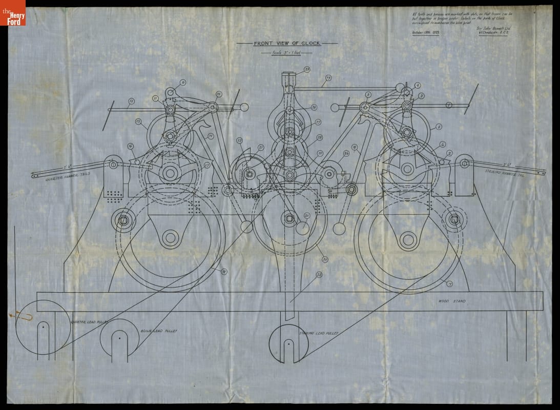 FRONT VIEW OF CLOCK / Scale: 3"=1 foot / All teeth and pinions are marked with dots, so that trains can be put together in proper order. Labels on the parts of Clock correspond to numbers on the blue print. / October 19th 1929 / Sir John Bennett Ltd. / 65 Cheapside, E.C.2