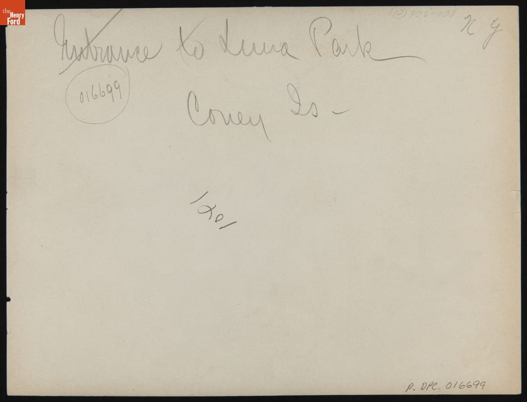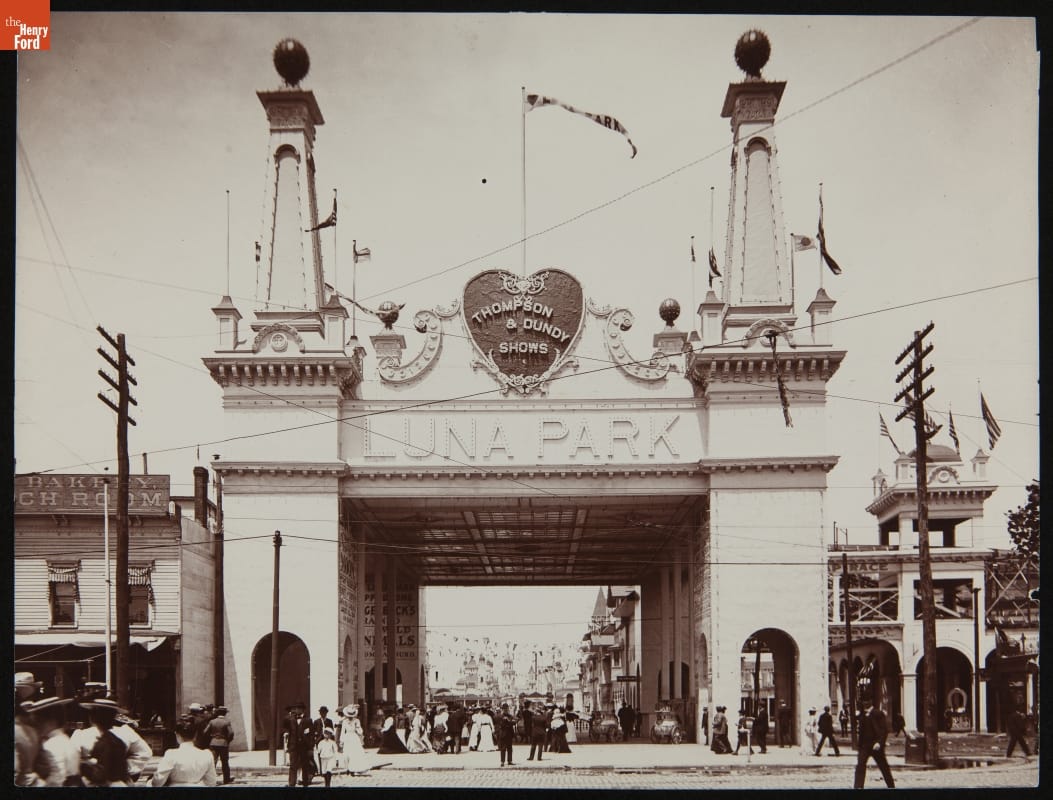 From 1895 to 1924, the Detroit Publishing Company was one of the world's major image publishers. Its wide-ranging stock of original photographs included scenes from around the globe. Coney Island had been a popular seaside getaway for New Yorkers since the 1850s. About 1900, it became home to three of America's first true amusement parks: Steeplechase Park, Luna Park, and Dreamland.