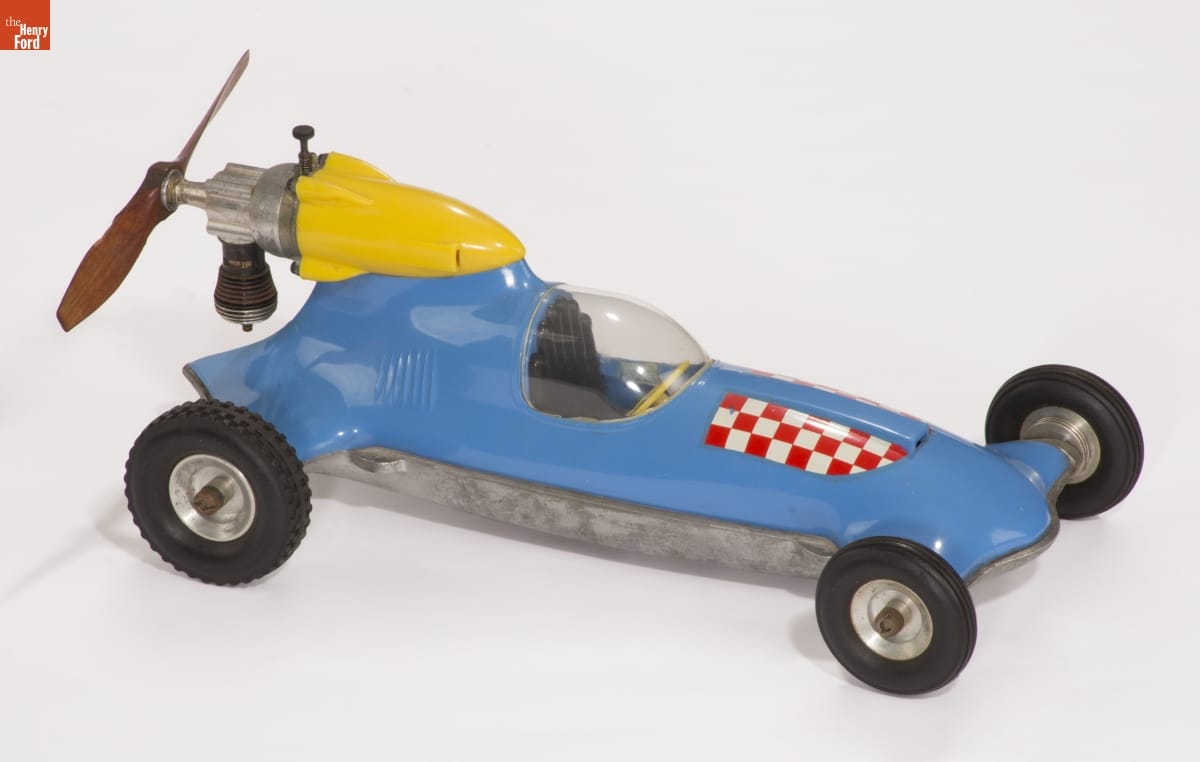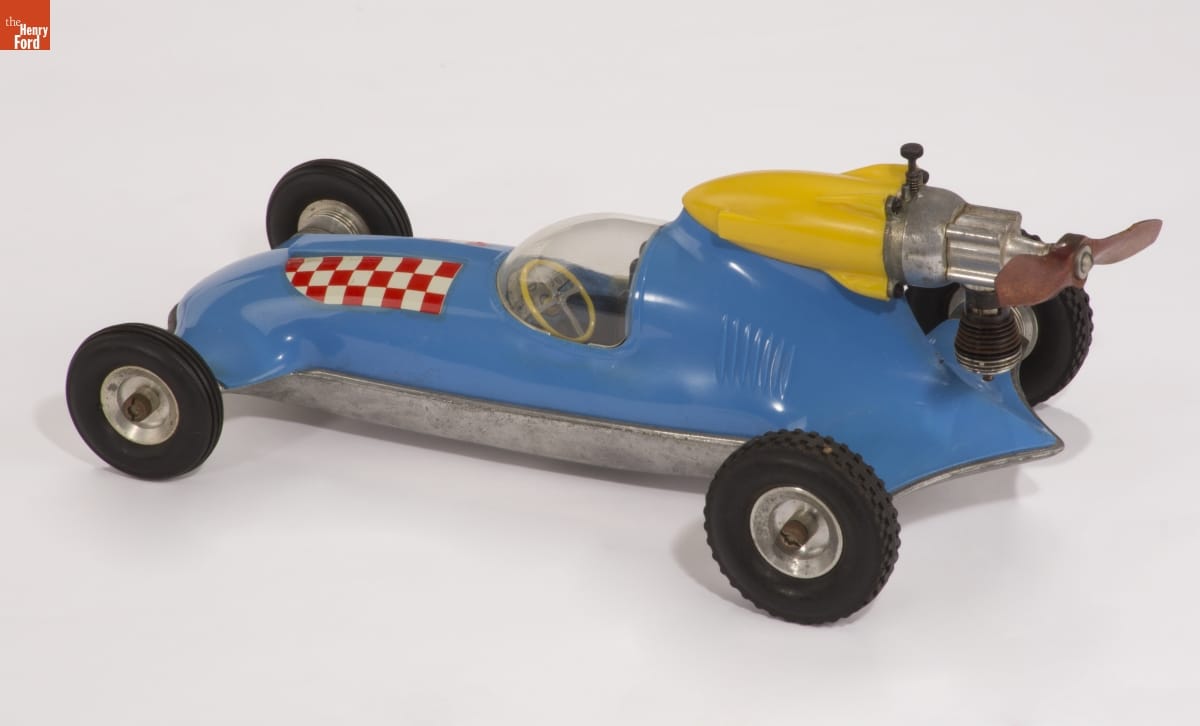Tether cars, gas-powered model race cars, were popular in the 1930s and 1940s. They were raced individually while tethered to a central pivot, or against each other on a scaled-down board track. Some car designs took inspiration from model airplanes and used propellers to push the vehicles forward. Propeller pusher systems were easy to build, but they weren't very efficient.