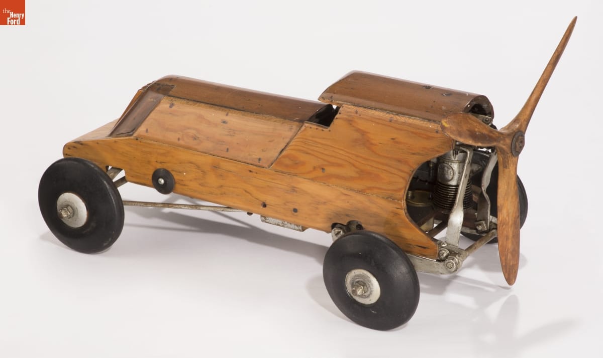 Tether cars, gas-powered model race cars, were popular in the 1930s and 1940s. They were raced individually while tethered to a central pivot, or against each other on a scaled-down board track. Some car designs took inspiration from model airplanes and used propellers to push the vehicles forward. Propeller pusher systems were easy to build, but they weren't very efficient.