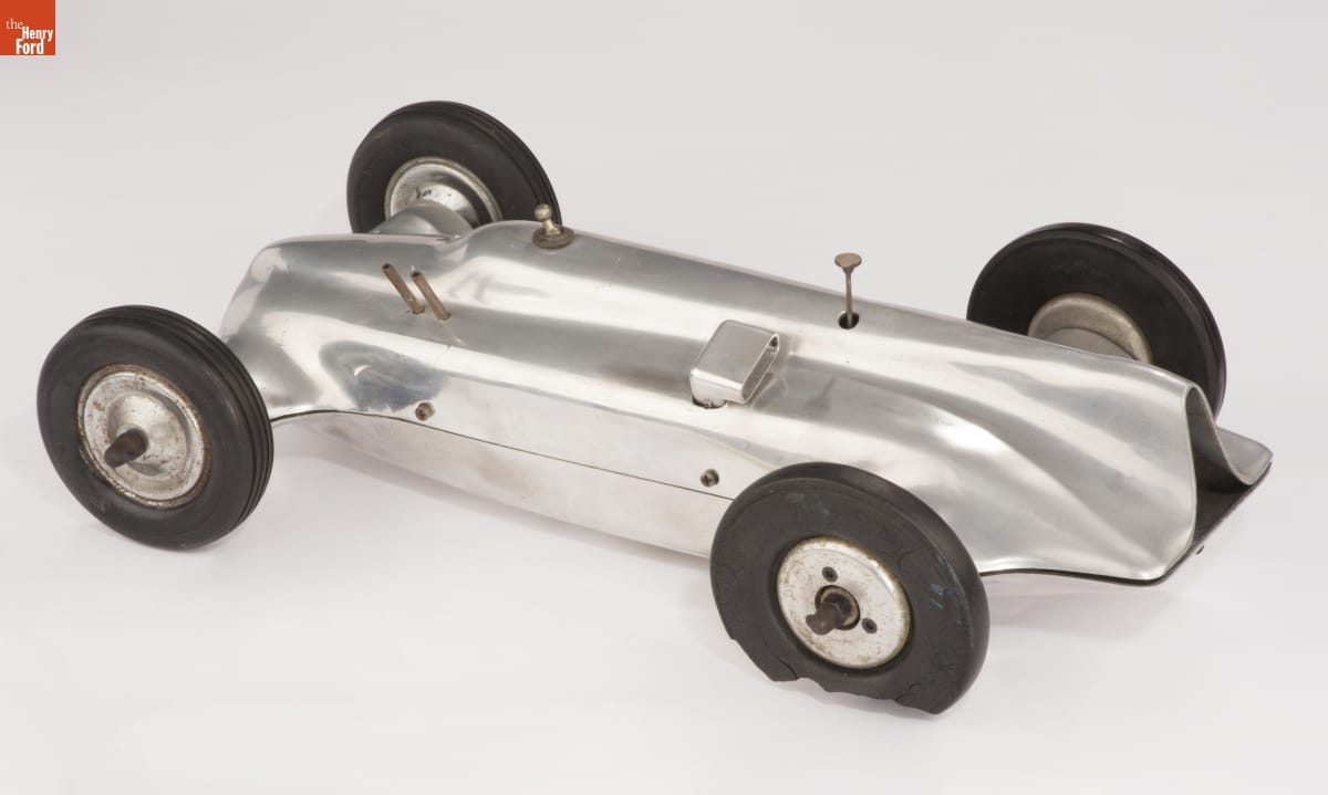Tether cars, gas-powered model race cars, were popular in the 1930s and 1940s. They were raced individually while tethered to a central pivot, or against each other on a scaled-down board track. Cabin cars, like this model, were developed in the search for more speed. While they generally didn't resemble real cars, they were more aerodynamic than open-cockpit models.