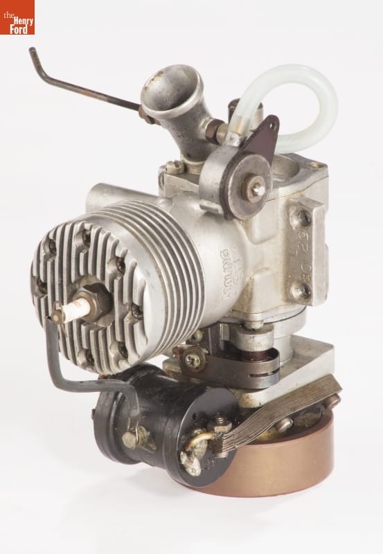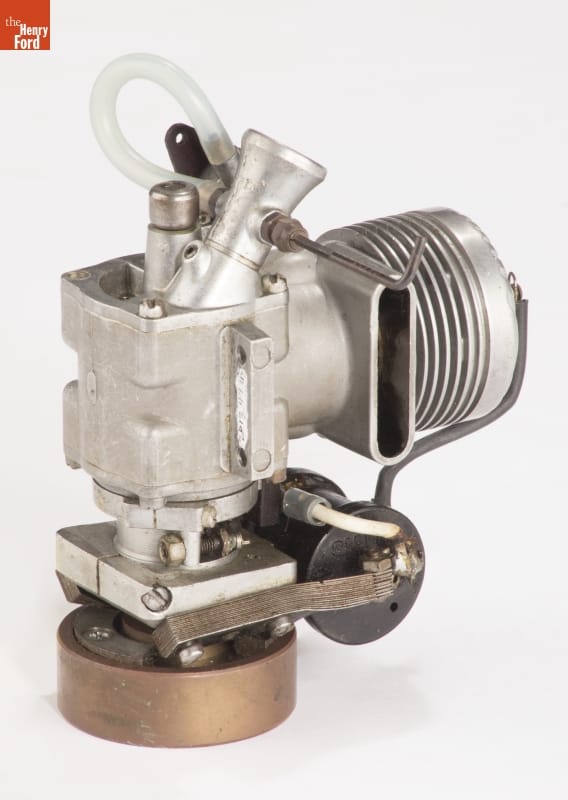 Tether cars, gas-powered model race cars, were popular in the 1930s and 1940s. They were raced individually while tethered to a central pivot, or against each other on a scaled-down board track. This Dooling Model 61 engine, named for its displacement of about .61 cubic inches, was fired by a small spark plug at the top of the single cylinder.