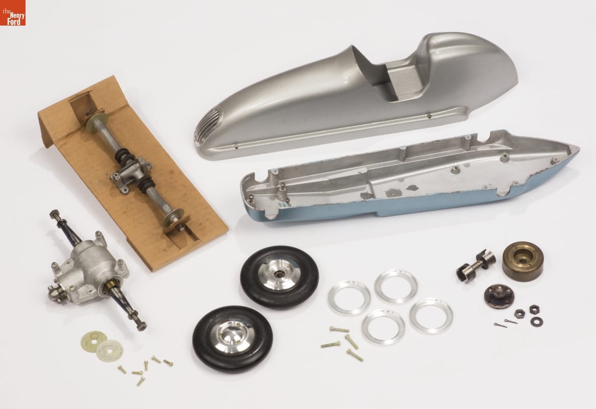 Tether cars, gas-powered model race cars, were popular in the 1930s and 1940s. They were raced individually while tethered to a central pivot, or against each other on a scaled-down board track. Dooling Brothers was one of the first companies to offer both kits and fully assembled cars. This Dooling F-car kit is still unassembled in its original packaging.
