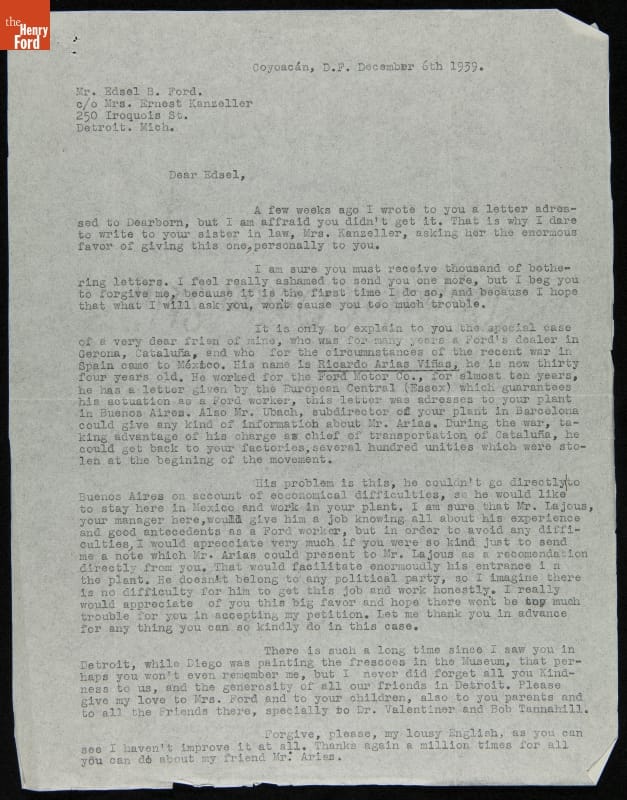 Letter from Frida Kahlo to Edsel Ford regarding Ricardo Arias Vinas, December 6, 1939