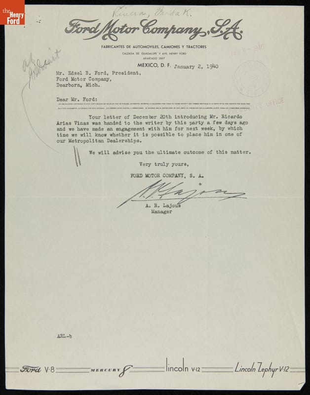 Letter from A. R. Lajous to Edsel Ford regarding Ricardo Arias Vinas, January 2, 1940