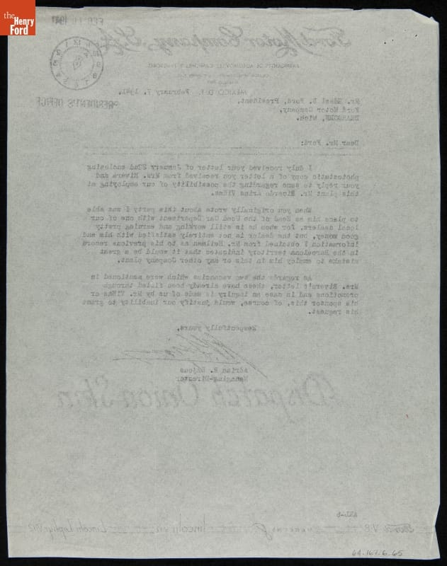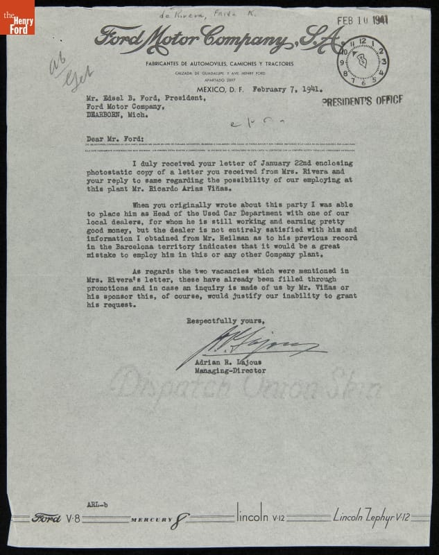 Letter from A. R. Lajous to Edsel Ford regarding Ricardo Arias Vinas, February 22, 1941