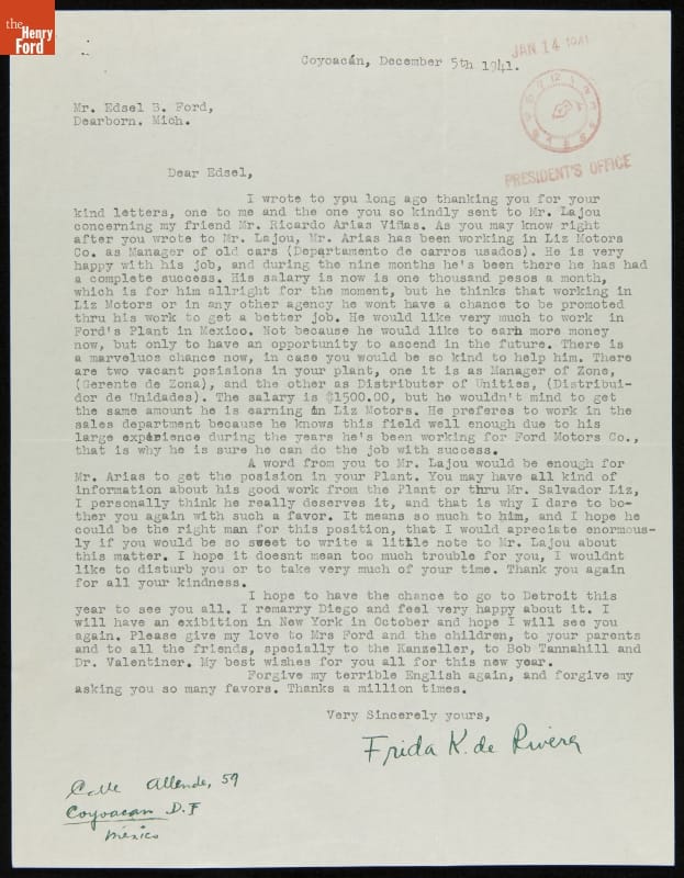 Letter from Frida Kahlo to Edsel Ford regarding Ricardo Arias Vinas, December 5, 1941