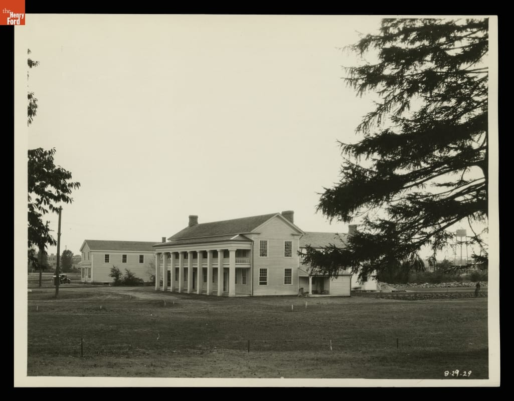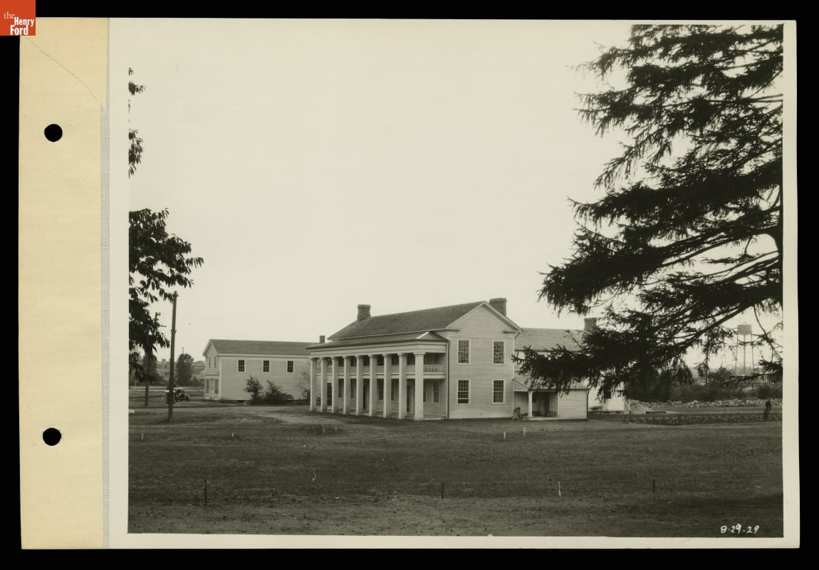 Henry Ford already owned four historic buildings destined for Greenfield Village by the time construction commenced in October 1927. Two of these--the Waterford General Store and the Clinton Inn--were re-erected around what would become the village green. This photograph shows the buildings nearly ready for the official dedication of Greenfield Village on October 21, 1929.