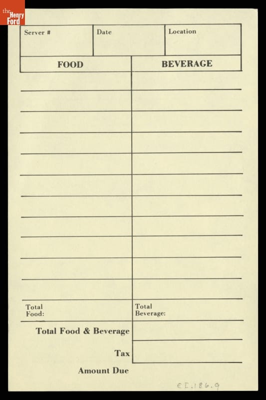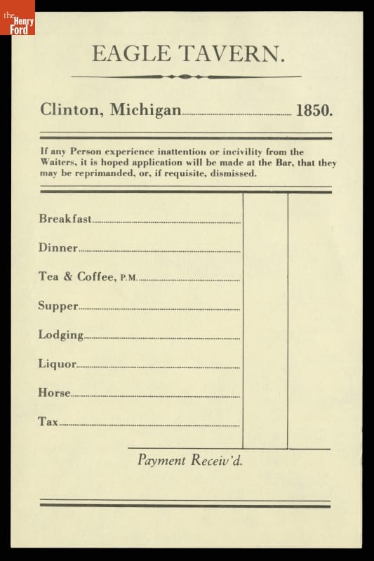 Billhead from Eagle Tavern, Greenfield Village, circa 1982