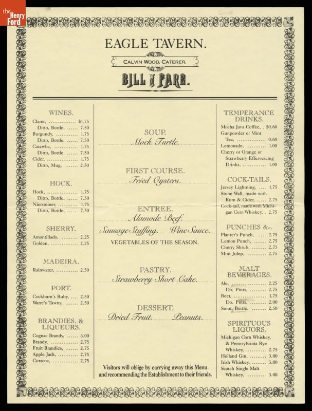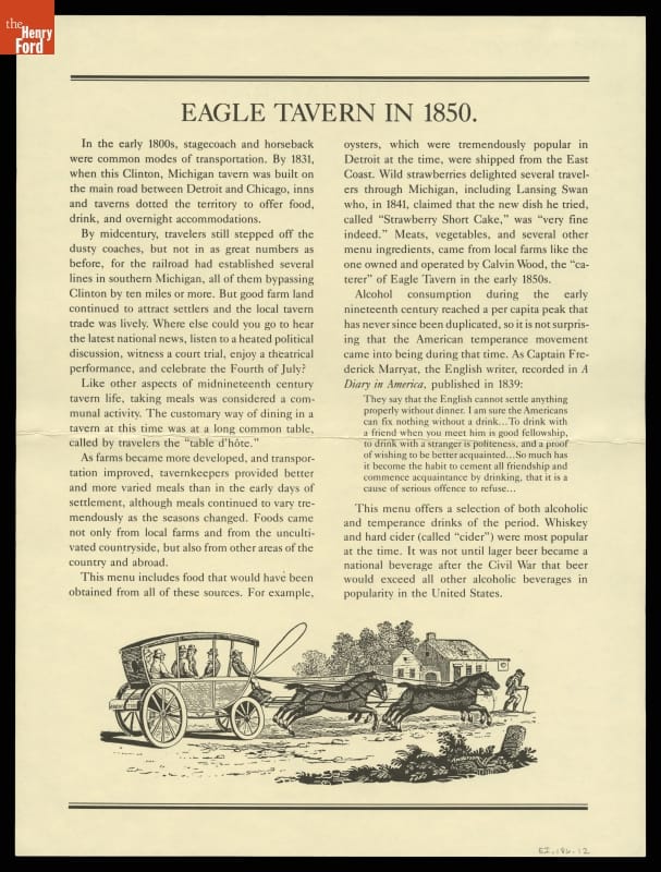 The 1982 transformation from the cafeteria-style Clinton Inn to the restaurant-style Eagle Tavern of the 1850s era included research on period foods, recipes, and menus. This re-created menu combined both food and drink from the 1850s era.