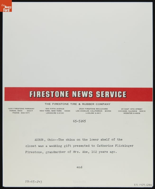 Catherine Ake, Granddaughter of Catherine Flickinger Firestone, Examines Wedding China Given to her Grandmother, 1965