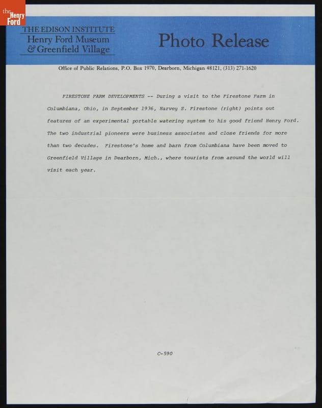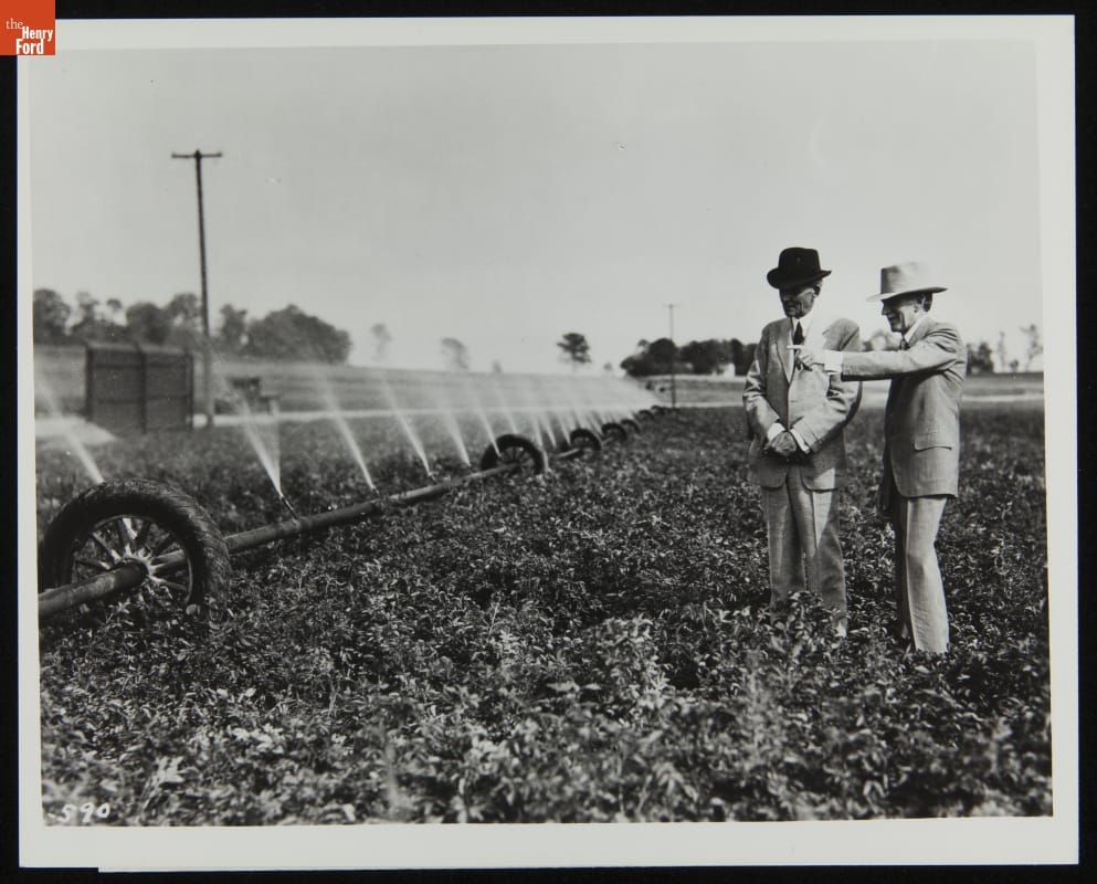 Henry Ford with Harvey S. Firestone, Watching an Experimental Watering System at Firestone Farm, Columbiana County, Ohio, 1936